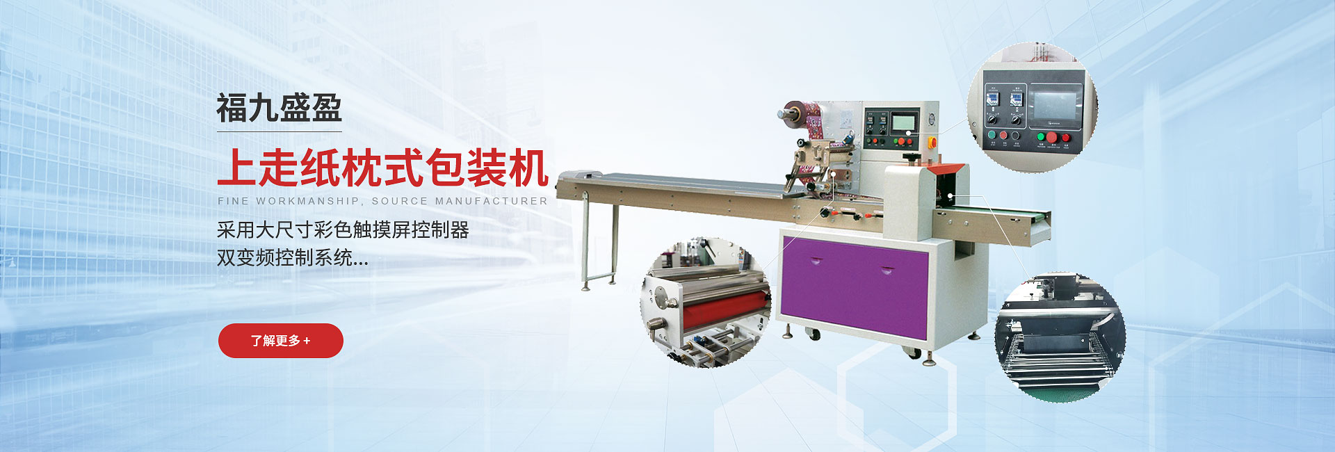 公司拥有3000平米的标准化装配制造车间;技术研发部融合(集团)各公司技术人才;融通发展,资源整合,通过并严格执行ISO质量体系认证,专注具有人工智能自动化的包装机设备;秉承自主设计;装配精良、质量第一,给客户提供加工生产高效稳定的设备。