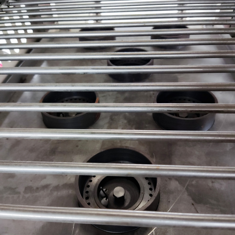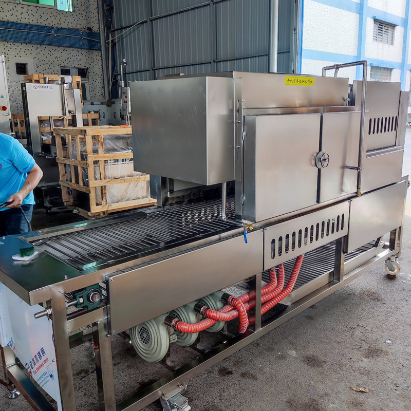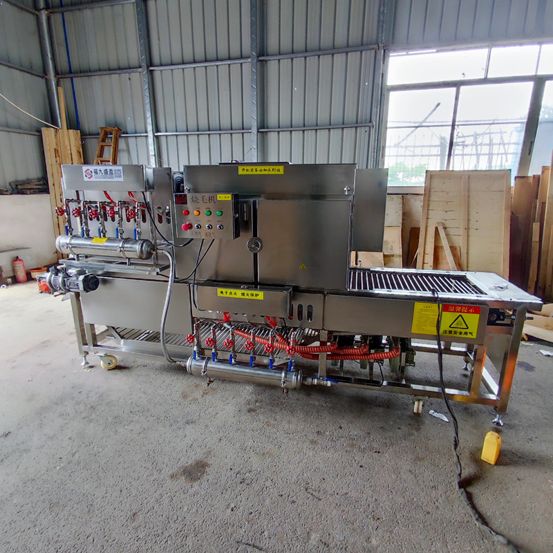 2024年8月23日、坐标广州九盈机械公司和腾博会食品机械公司综合厂区;新型大猪脚烧毛机整装待发;该设备主要用于猪脚、肘子、清除肉皮表层的长毛、具有高效安全、操作简单的特点、特别是根据客户生产物料的大小可以进行、输送变速、火苗大小调整、本机具有天然气和液化气双用的功能;采用上层5头喷火、下层6头喷火;共计11个喷火头360度全覆盖燃烧;