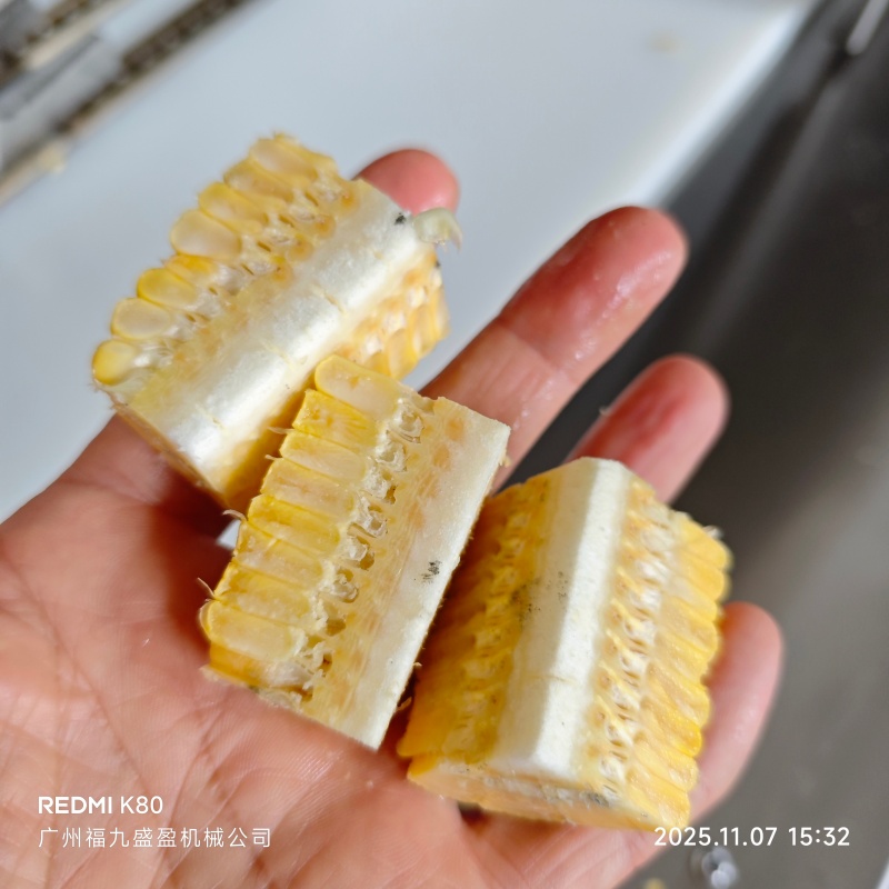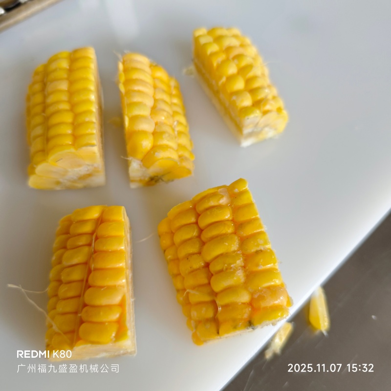 设备的核心竞争力在于“快且好”。分瓣环节采用连续式V型导轨输送系统,能牢牢固定玉米棒,确保投料居中分切,无论是鲜玉米还是冷冻玉米,都能实现切面光滑整齐、不掉粒无碎渣;切段速度可灵活调节,每分钟稳定加工30-40穗,相比传统人工或单机加工,效率提升超50%。同时,30m/s的高速锯切割配合锯带压力张紧装置,进一步减少切割碎屑,让成品率提升至95%以上。
